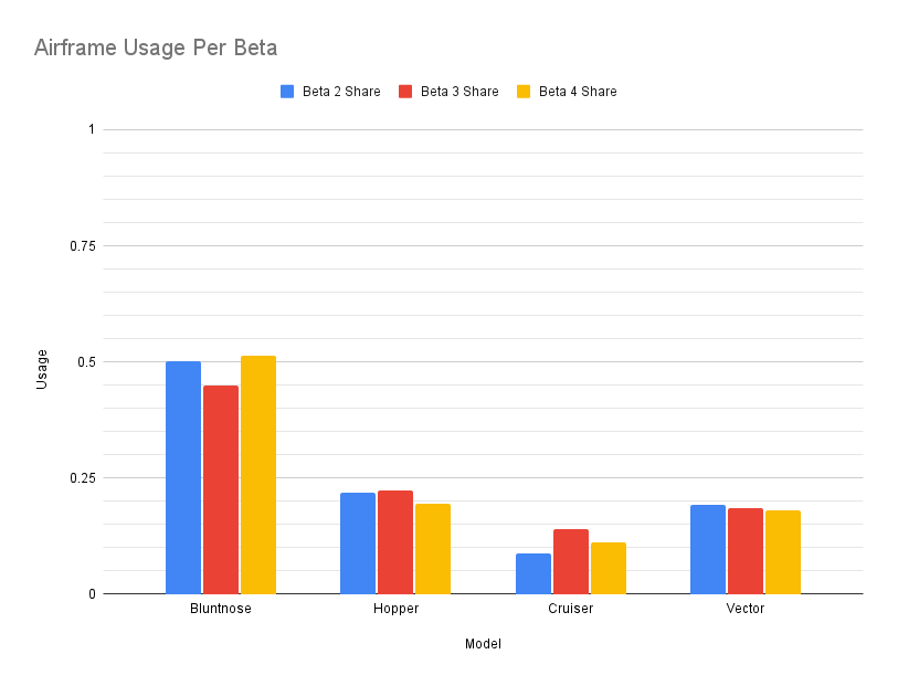And now time for the vehicles themself. Throughout the beta, all airframes have about the same pick rate. The bluntnose has the highest pick rate at around 50%. This might seem like it is overpowered and needs a nerf but to us, this is a good number. The Bluntnose is an all-arounder that should satisfy most players.